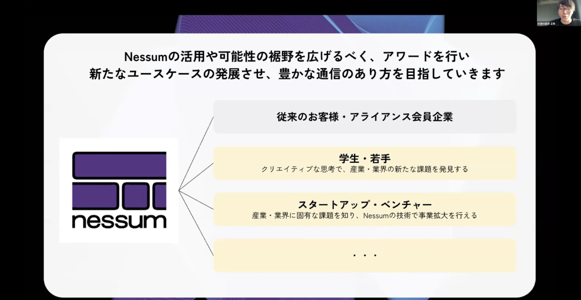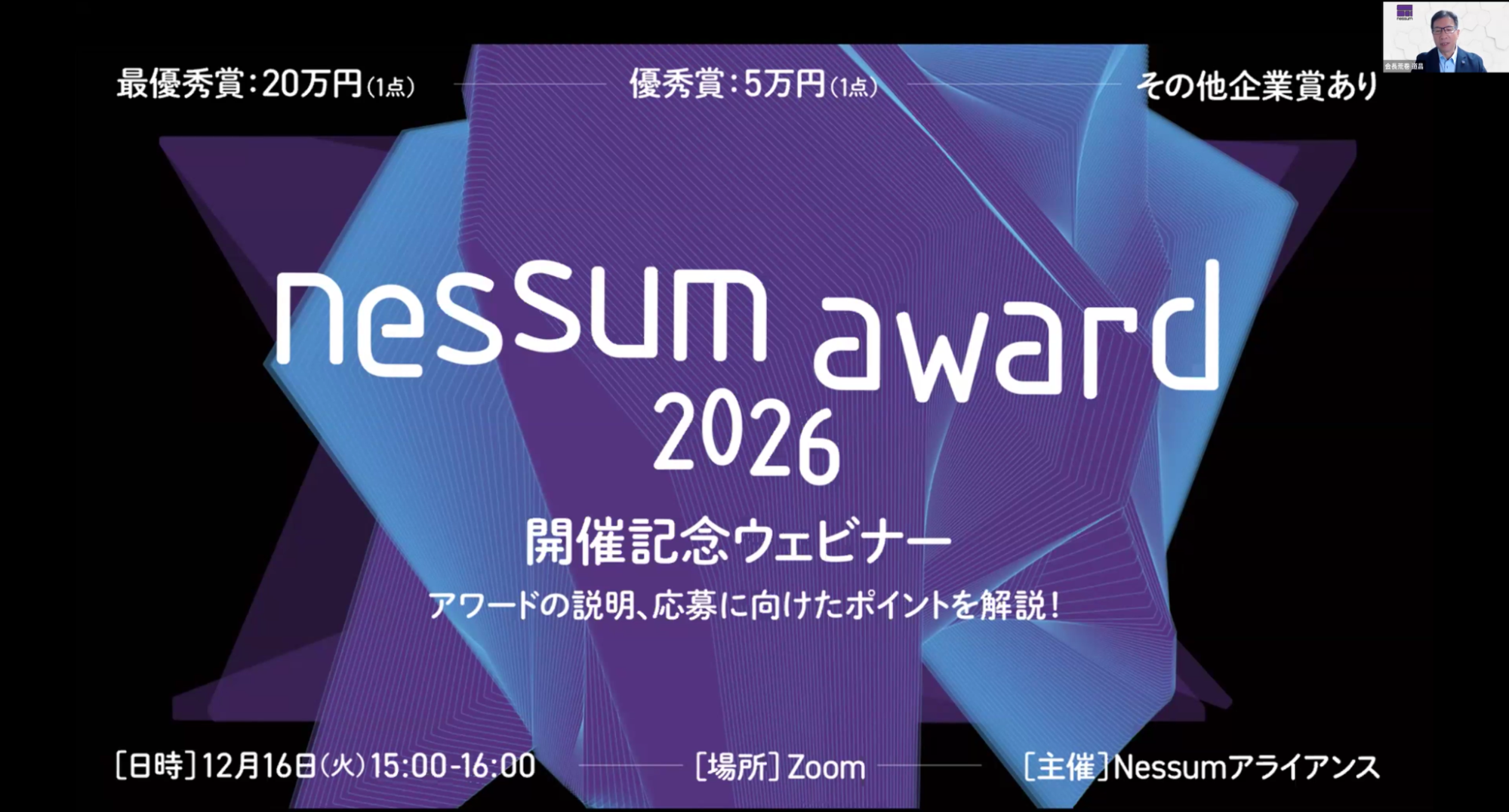 12月15日、オンラインにてアワードの趣旨説明やNessumの解説を行う、アワード開催記念ウェビナーを実施しました。